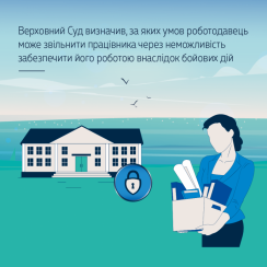 Верховний Суд зазначив, що введення воєнного стану автоматично не означає знищення (відсутність) виробничих, організаційних та технічних умов, засобів виробництва або майна роботодавця внаслідок бойових дій. При цьому Суд зауважив, що п. 6 ч. 1 ст. 41 КЗпП України не містить умов, за якими трудовий договір може бути розірваний з ініціативи роботодавця у зв’язку з нерентабельністю внаслідок того, що установа фактично не працює, чи неможливістю роботодавця організувати безпеку працівникам тощо.
