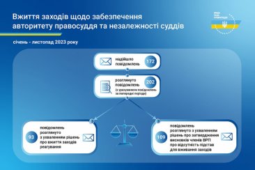 172 повідомлення про втручання у професійну діяльність суддів щодо здійснення правосуддя та дії, що порушують гарантії незалежності суддів або підривають авторитет правосуддя, надійшло до Вищої ради правосуддя упродовж одинадцяти місяців 2023 року. З урахуванням повідомлень, які надійшли за попередні періоди, ВРП з початку цього року розглянула 202 повідомлення суддів.