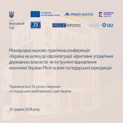 З нагоди 33-ї річниці утворення господарських (арбітражних) судів 31 травня 2024 року Касаційний господарський суд у складі Верховного Суду спільно з проєктом Спеціального представника Головування ОБСЄ – Координатора проєктів в Україні «Підтримка Верховного Суду та вищих судів у реалізації судової реформи та забезпеченні доступу до правосуддя в умовах війни», Німецьким фондом міжнародного правового співробітництва, проєктом Ради Європи «Підтримка судової влади України в умовах війни та післявоєнного періоду», проєктом Європейського Союзу «Право-Justice» проводитиме Міжнародну науково-практичну конференцію «Україна на шляху до євроінтеграції: ефективне управління державною власністю як інструмент відновлення економіки України. Місія та візія господарської юрисдикції».