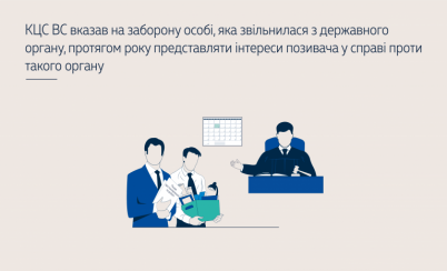 КЦС ВС погодився з висновками судів попередніх інстанцій, що звернення представника в інтересах позивача до суду до спливу річного строку після звільнення представника з посади у ФССУ з позовом до ФССУ порушує положення п. 3 ч. 1 ст. 26 Закону України «Про запобігання корупції», яка містить пряму заборону представнику протягом року з дня припинення відповідної діяльності представляти інтереси будь-якої особи у справах (у тому числі, в тих, що розглядаються в судах), у яких іншою стороною є орган, підприємство, установа, організація, в якому (яких) вони працювали на момент припинення зазначеної діяльності.