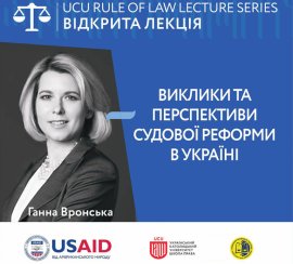 Центр верховенства права Школи права Українського католицького університету (УКУ), грантер Програми USAID «Нове правосуддя», організовує лекцію Ганни Вронської – судді Верховного Суду. Пані Вронська представить презентацію на тему «Виклики та перспективи судової реформи в Україні» у рамках Серії відкритих лекцій «Правовладдя». Захід покликаний сприяти вдосконаленню якості юридичної освіти шляхом використання сучасних методів навчання та підвищення обізнаності про наскрізні питання верховенства права та судової реформи. Місце проведення: Центр митрополита Андрея Шептицького УКУ, Паркова аудиторія, вул. Козельницька, 2а, Львів. Вхід вільний за умови попередньої реєстрації за посиланням: http://bit.ly/2sQbaiv.