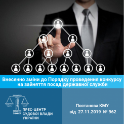 Постановою Кабінету Міністрів України від 27 листопада 2019 року № 962 внесено зміни до Порядку проведення конкурсу на зайняття посад державної служби, затвердженого постановою Кабінету Міністрів України від 25 березня 2016 р. № 246 (Офіційний вісник України, 2016 р., № 28, ст. 1116; 2017 р., № 71, ст. 2163, № 88, ст. 2698; 2018 р., № 4, ст. 161, № 41, ст. 1453; 2019 р., № 47, ст. 1604, № 66, ст. 2289, № 78, ст. 2695, № 88, ст. 2944, № 90, ст. 2993).